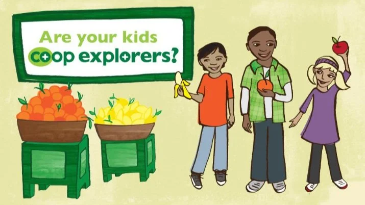 Kids and parents stop by the Produce Department, where we keep the designated Co+op Explorers fruit basket. Next to the fruit basket, you'll find Co+op Explorers stickers. Take a sticker and put it on your child's shirt or jacket. Then, each child is eligible to take one piece of fruit and enjoy eating it while you shop.
